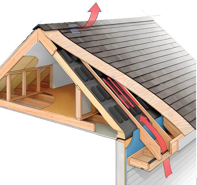Це обов’язковий елемент для будь-якої покрівлі, особливо для мансардної. Вона забезпечує відведення вологи та водяної пари з-під покрівельного матеріалу та утеплювача. Принцип полягає в тому, що холодне повітря надходить через карнизні отвори (софіти), проходить під покрівлею і виходить через вентиляційні елементи на конику даху (конькові аератори, вентвиходи Krono-Plast).